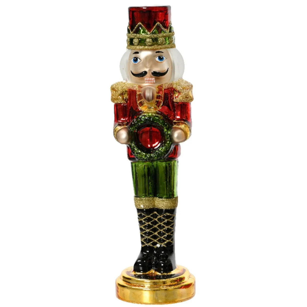 Elevate your festive decor with our exquisite 12″ Glass Nutcracker figurine, a masterful blend of traditional charm and artisan craftsmanship. Boasting a shimmering glass body, this eye-catching piece is crowned with a vibrant red hat, adding a splash of color to its intricate details. Perfect for holiday enthusiasts or collectors, our glass nutcracker stands tall as both a statement piece and a timeless holiday treasure. Its sturdy base ensures stability, while its glistening exterior reflects the surrounding lights, creating a magical atmosphere. Add this elegant Glass Nutcracker with a red hat to your collection and watch it become the focal point of your festive displays year after year.