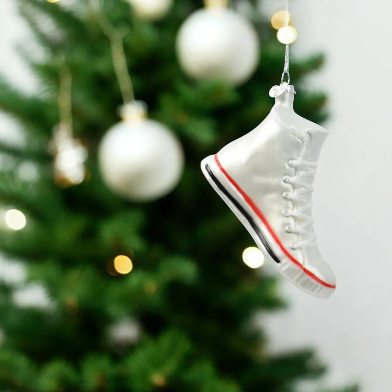 Brighten up your Christmas tree with our Glass White High Top Sneaker Ornament! This 4.5-inch tall, 3-inch wide ornament features a classic high-top sneaker design in a sleek white finish with a touch of sparkle.