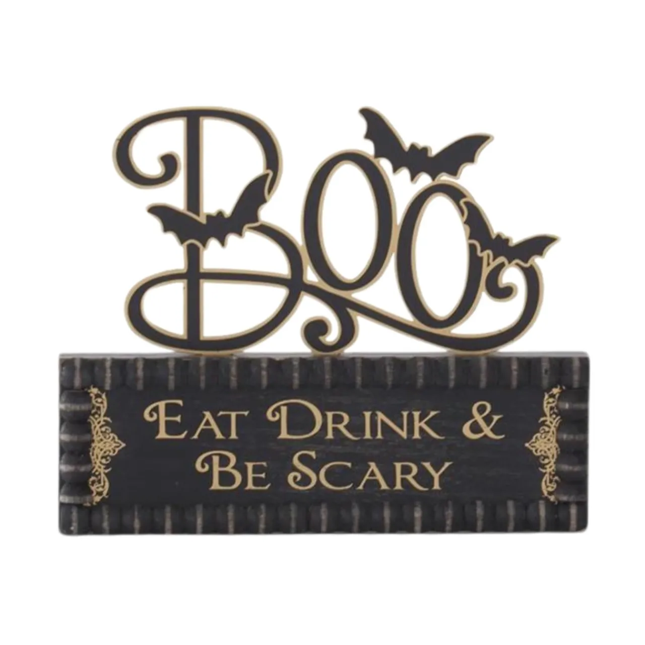 Bring festive fun to your Halloween decor with this “Boo” cutout sign featuring flying bats and the playful message, “Eat, Drink & Be Scary.” Made from a combination of MDF wood, walnut wood, and tin, this sturdy decor piece measures 7.75 inches tall and 9.5 inches wide.