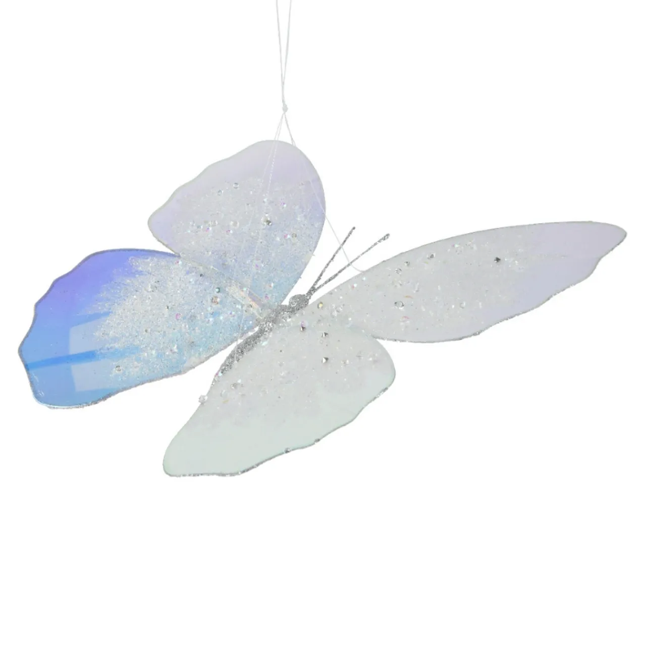 Add a touch of ethereal beauty to your holiday decor with the Large Iris Butterfly Ornament. Measuring 11.02 inches in height, this stunning ornament is crafted from durable plastic and features iridescent wings adorned with glitter and sequins.