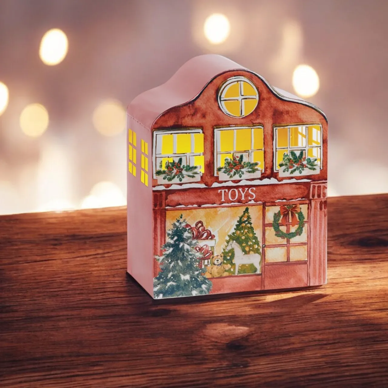 Brighten your holiday display with this charming LED Toy Shop. Standing at 10 inches tall, this beautifully detailed iron shop features glowing windows and festive holiday decor.