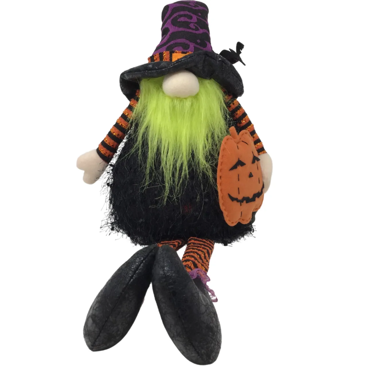 Add a little bit of whimsy to your Halloween decor with this LED battery operated sitting gnome. Holding a pumpkin and featuring a bright green beard, purple hat, and orange striped arms and legs this piece is sure to be loved by all. The body of the gnome sits approximately 11″ tall with a posable hat that can increase the total height to 19″. The legs are soft giving the opportunity to dangle over the edge of a shelf or riser. The LED lights inside the body transition through multiple colors making this a cute Halloween themed nightlight for a child’s room. Set the ON/OFF Switch to timer and don’t worry about having to remember to turn this gnome on each day!