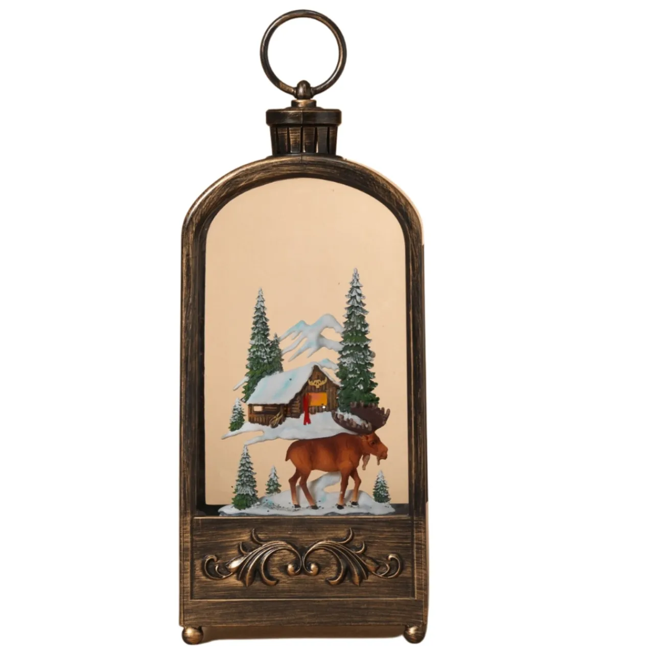 Introducing our captivating 13-inch Light Up Shimmer Lantern w/Moose, a stunning addition to your home decor. This enchanting lantern showcases a majestic moose standing amidst a serene wooded setting, beautifully illuminated from within. With a shimmering effect, the light dances and creates a magical ambiance. Crafted with intricate detail and quality materials, this lantern adds a touch of rustic charm to any space. Whether placed on a tabletop or hung as a centerpiece, let this shimmering lantern with a moose bring the tranquility of the wilderness into your home and captivate your senses with its serene beauty.