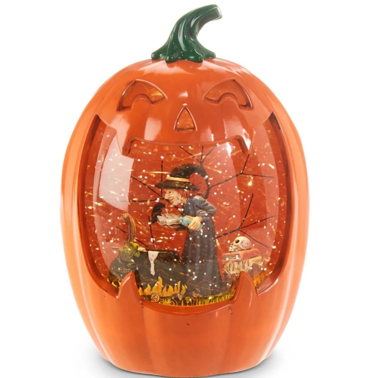 This stunning water lantern features a carved pumpkin design with intricate details, along with a witch and cauldron that glow and shimmer when turned on. The lantern is filled with water, creating a mesmerizing effect as the light dances and reflects off the surface. The lantern is made of high-quality materials and measures approximately 8.5 inches in height, with a convenient on/off switch located at the bottom. It also includes a timer function, allowing you to set it for 6 hours on and 18 hours off, making it a hassle-free addition to your Halloween display. Whether you’re looking for a centerpiece for your Halloween party or simply want to add some spooky ambiance to your home, this lantern is sure to impress. It’s perfect for placing on your mantel, table, or any other surface that needs a touch of Halloween magic. Not only is this lantern a unique and eye-catching decoration, but it also makes a great gift for anyone who loves Halloween, pumpkin carving, or just anything spooky and fun. It’s sure to be a hit among friends and family. So why not add some shimmer and spookiness to your Halloween décor with the Lighted Carved Pumpkin Water Lantern Shimmer with Witch and Cauldron? Get yours today and enjoy the perfect blend of Halloween magic and mesmerizing water effects!