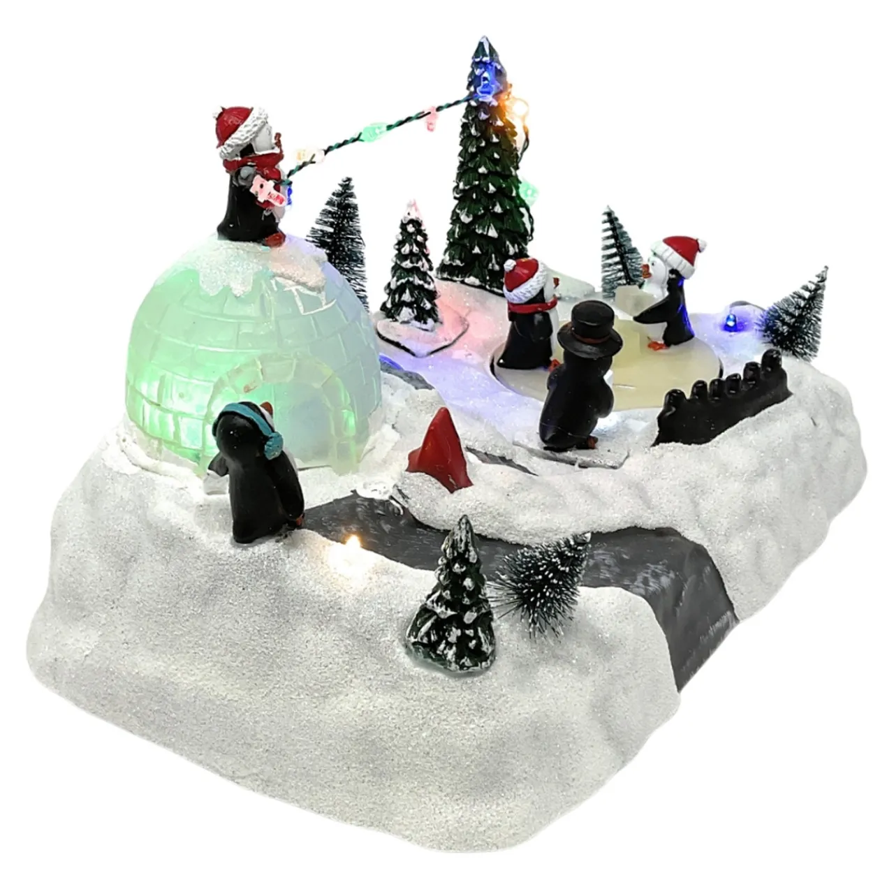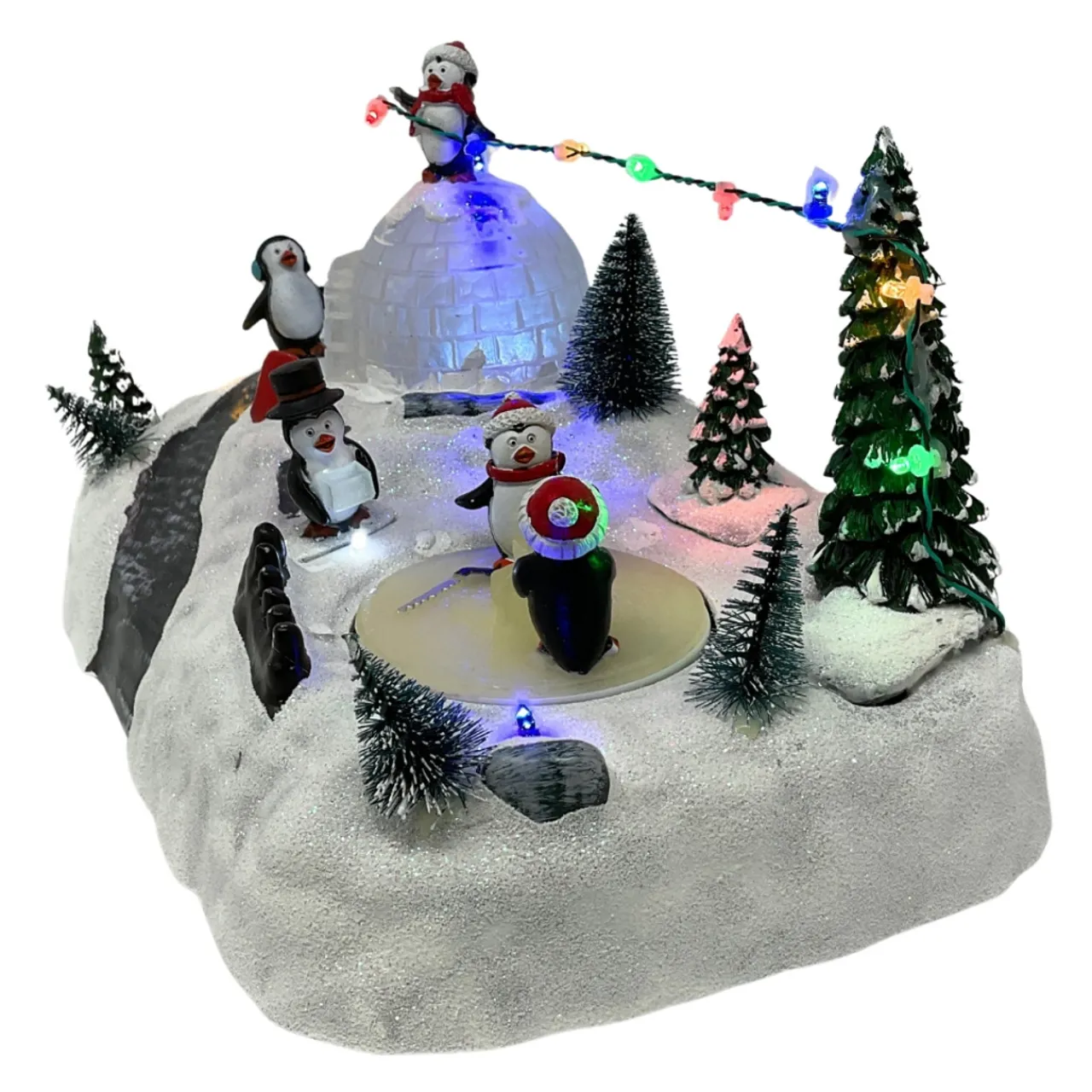Dive into the holiday spirit with Lumineo’s Penguins At Play Scene! Watch five industrious penguins adorn their wintry world with multicolored lights and joy. As two playful penguins spin, stacking ice blocks by the color-changing igloo, this charming display captures the whimsical side of winter. All set in a plastic and sisal winter wonderland, this animated piece is sure to slide into your heart and home with heaps of holiday cheer.
