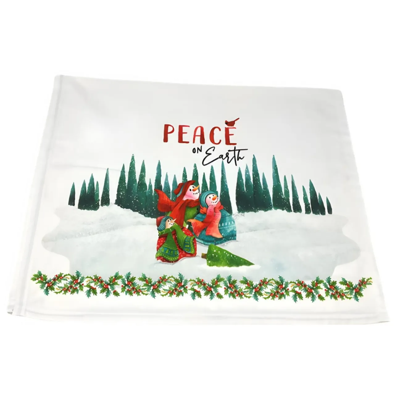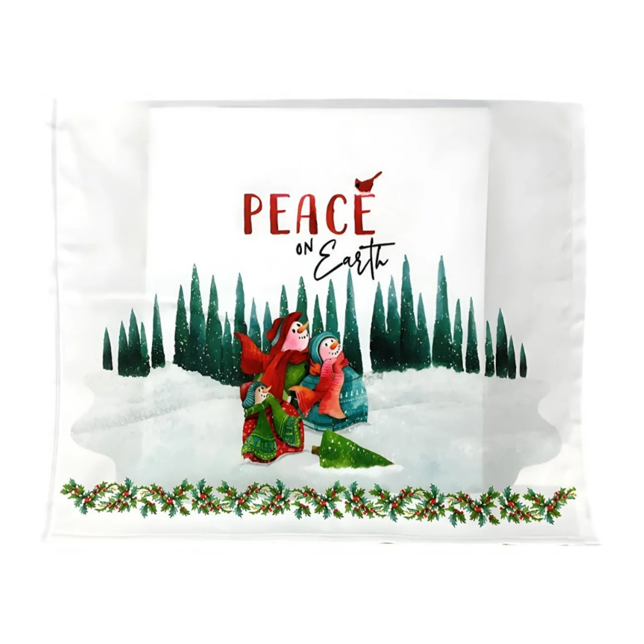 Invoke the serene joy of the holiday season with our Peace on Earth Snowman Tea Towel. This charming kitchen accessory features a snowman family and a cardinal in a whimsical winter scene, bringing a touch of magic to your daily routine.