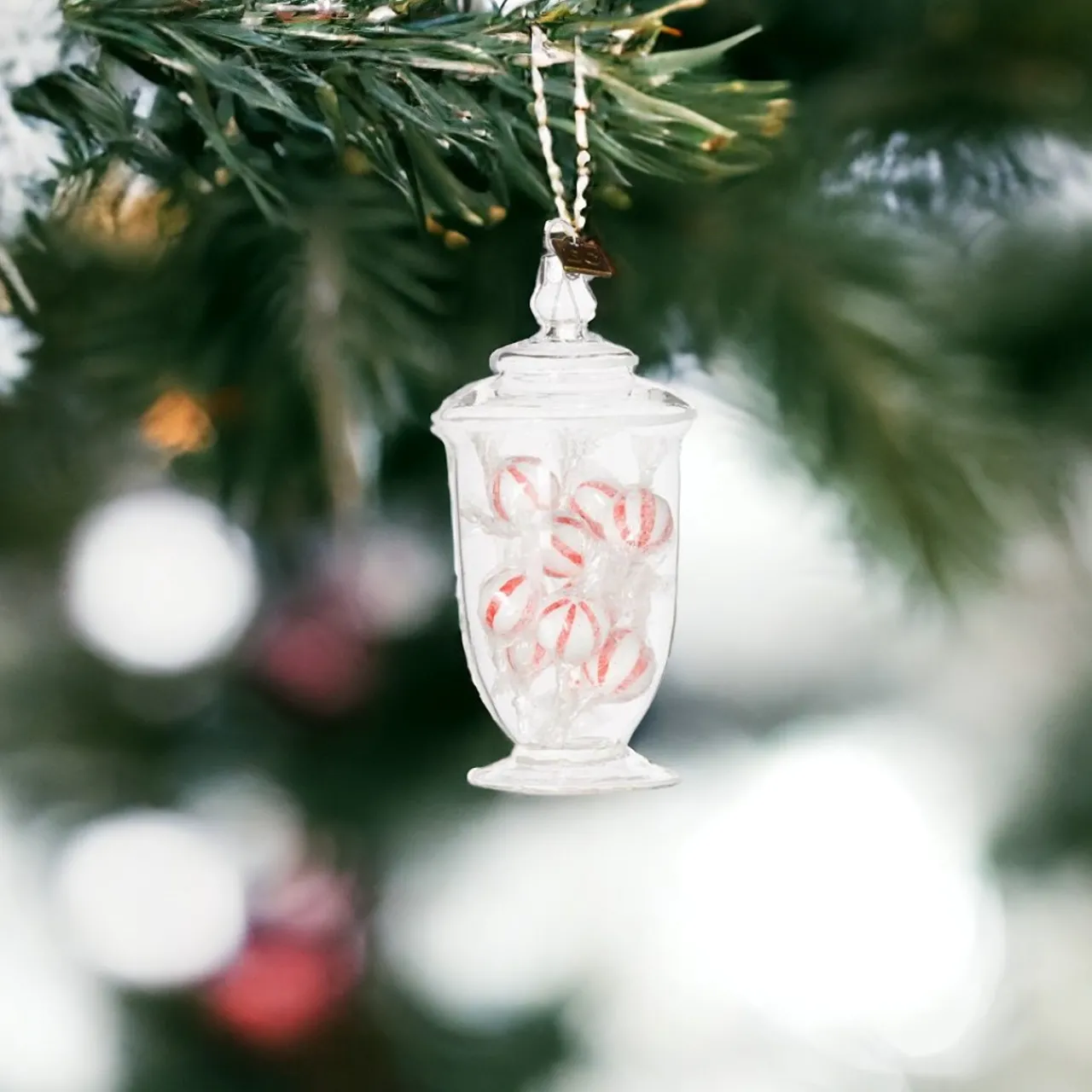 Sweeten up your holiday decor with this Peppermint Candy Jar Ornament. Featuring a clear glass jar filled with charming peppermint candies, this ornament adds a delightful touch to your Christmas tree.