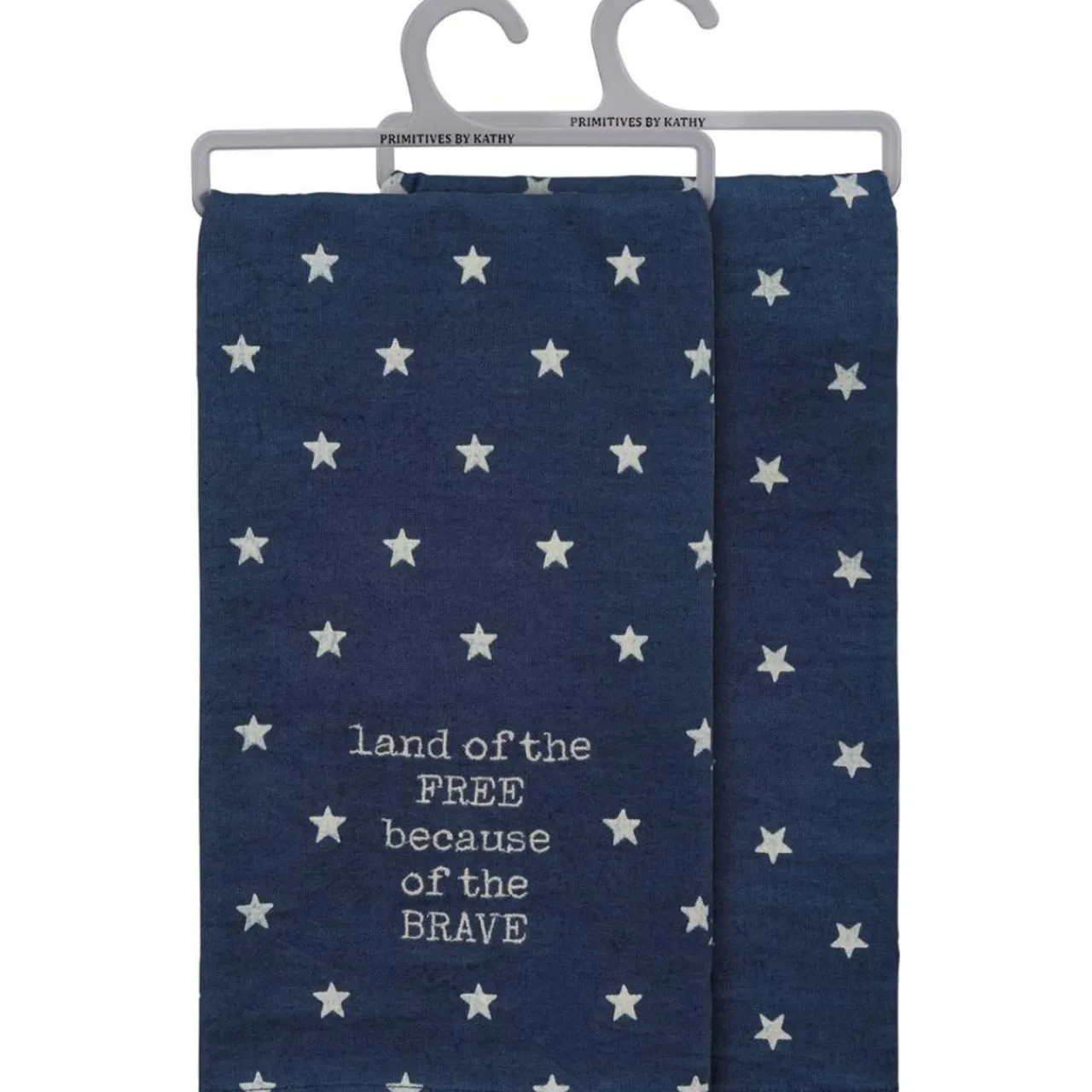 A blue cotton kitchen towel featuring an all-over star print and embroidered “Land Of The FREE Because Of The BRAVE” sentiment. Machine-washable.
