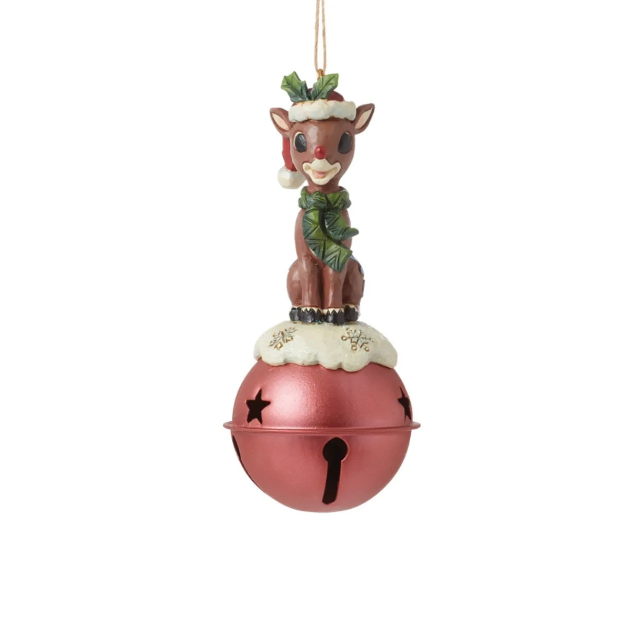 This adorable tree ornament from Jim Shore features Rudolph the Red-Nosed Reindeer sitting atop a large jingle bell covered in snow.