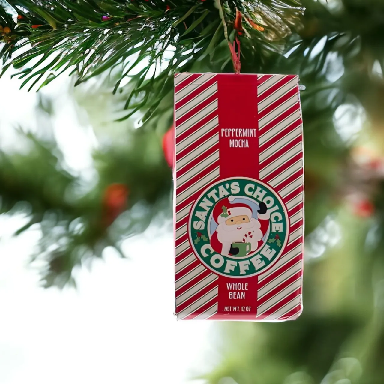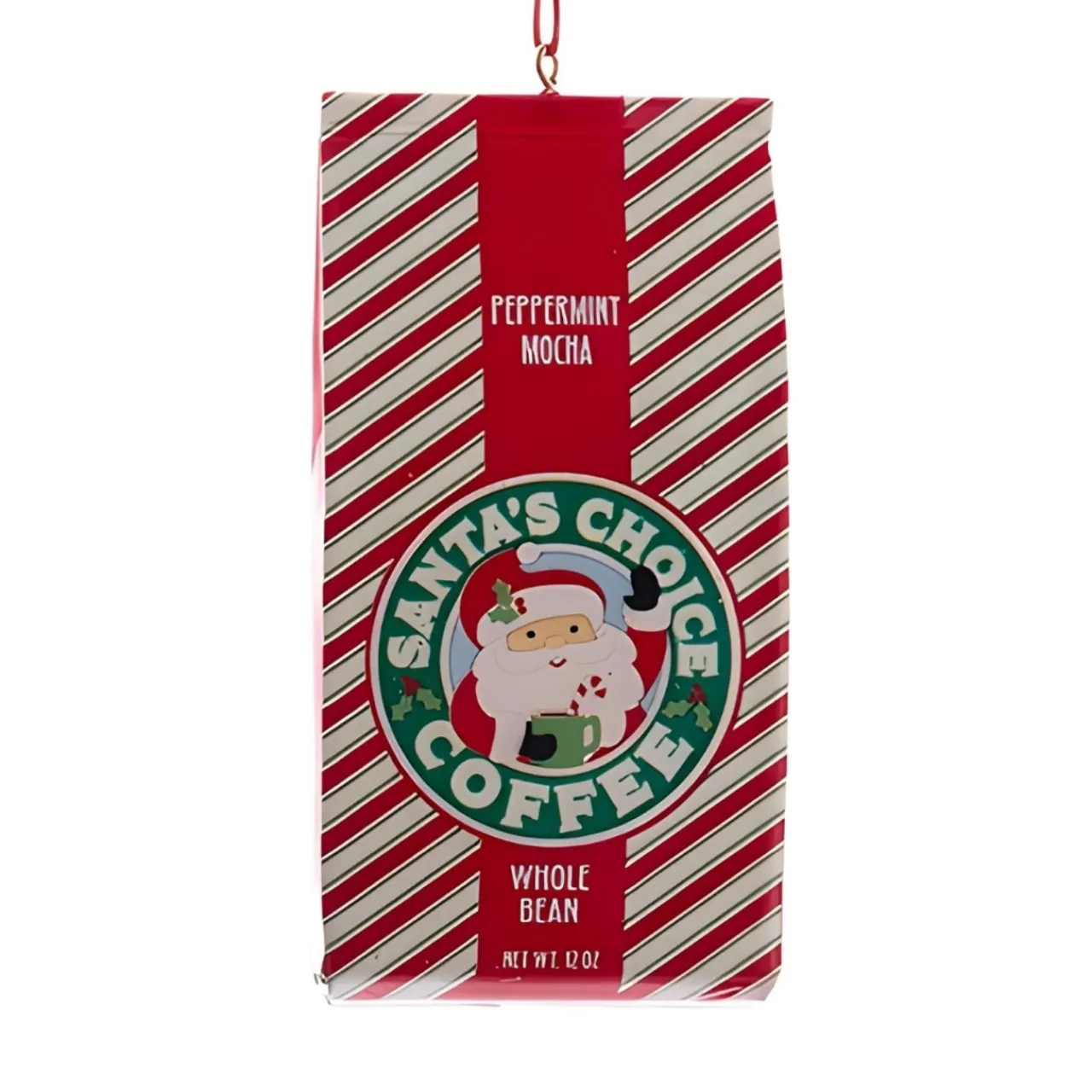 Deck your tree with Santa’s own blend, the 4.75″ Santas Choice Bag of Coffee Ornament. Meticulously crafted from plastic, this Kurt Adler novelty brews up a storm of holiday joy, featuring a festive peppermint mocha design, perfect for coffee aficionados and Christmas enthusiasts alike.