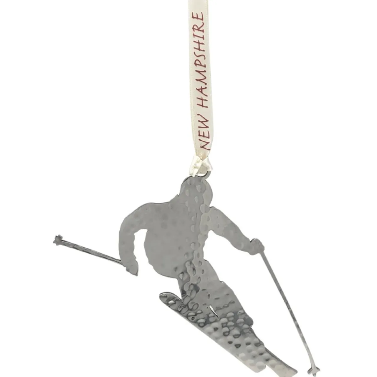 Each winter thousands of visitors from across the world travel to New Hampshire to visit some of the 28 different ski resorts throughout the state. Commemorate your NH skiing trip with this silver skier ornament. Designed by an Ohio artist this beautiful stainless steel ornament will bring you and yours a lifetime of memories. Ribbon font may vary from font pictured.