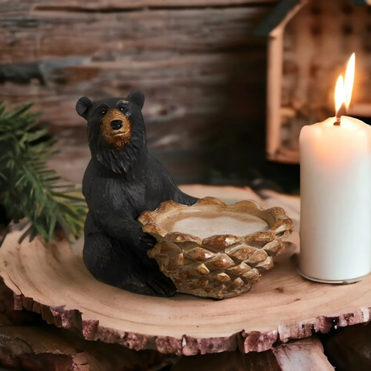 Add a touch of woodland charm to your home with this Sitting Black Bear with Pinecone Candle Holder. This adorable candle holder features a black bear holding a pinecone, perfect for adding a rustic and cozy vibe to any room.