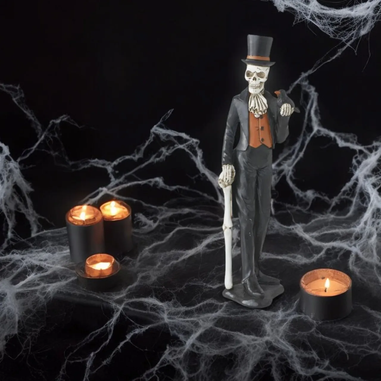 Add a dash of eerie elegance to your Halloween décor with this 13-inch Resin Skeleton Man. Dressed in a dapper suit with a top hat and holding a crow on his arm, this figure is both spooky and sophisticated.