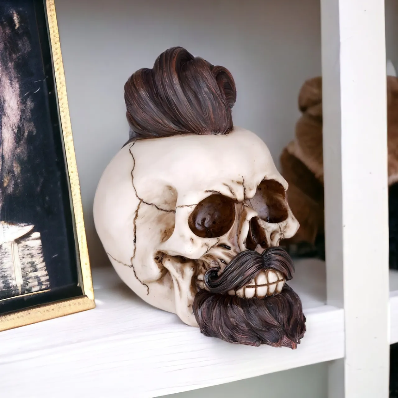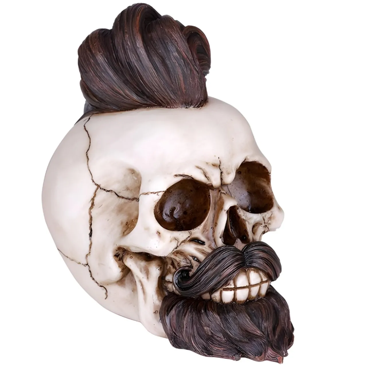 Discover the hand-painted Skull with Beard and Hair Figurine, a unique piece blending macabre and style, perfect for collectors. Resin.
