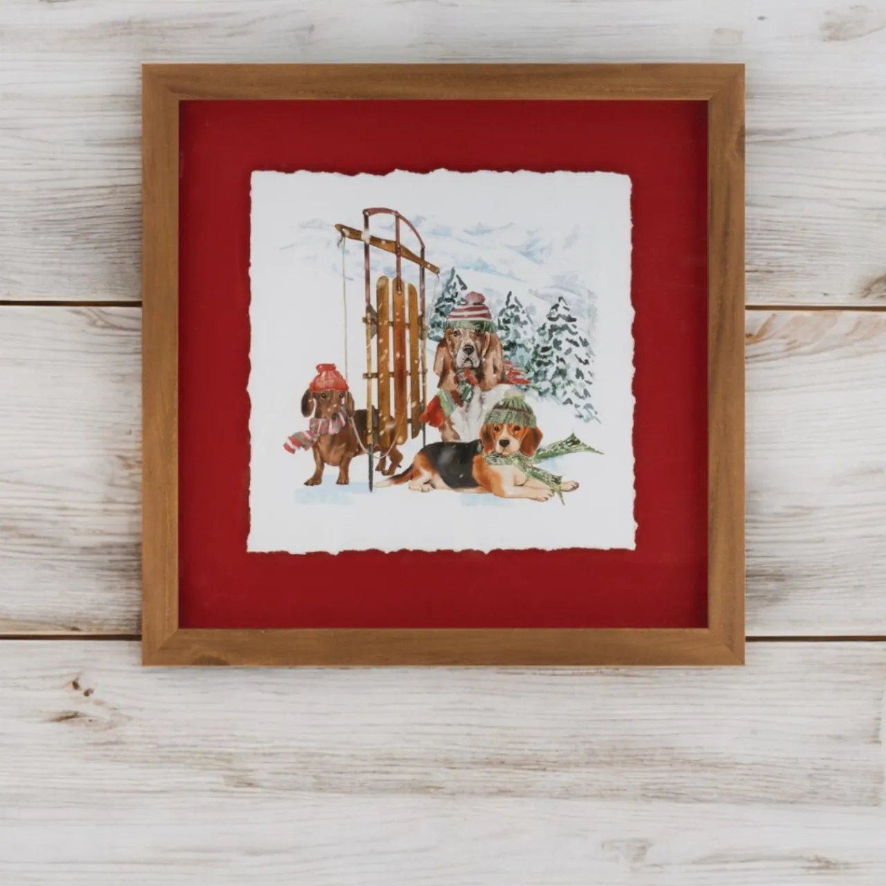 Add a touch of winter wonderland fun to your home with the Sled Dogs Print! This 12-inch square art piece features three adorable dogs enjoying a sledding day in the snow, complete with winter hats and scarves.