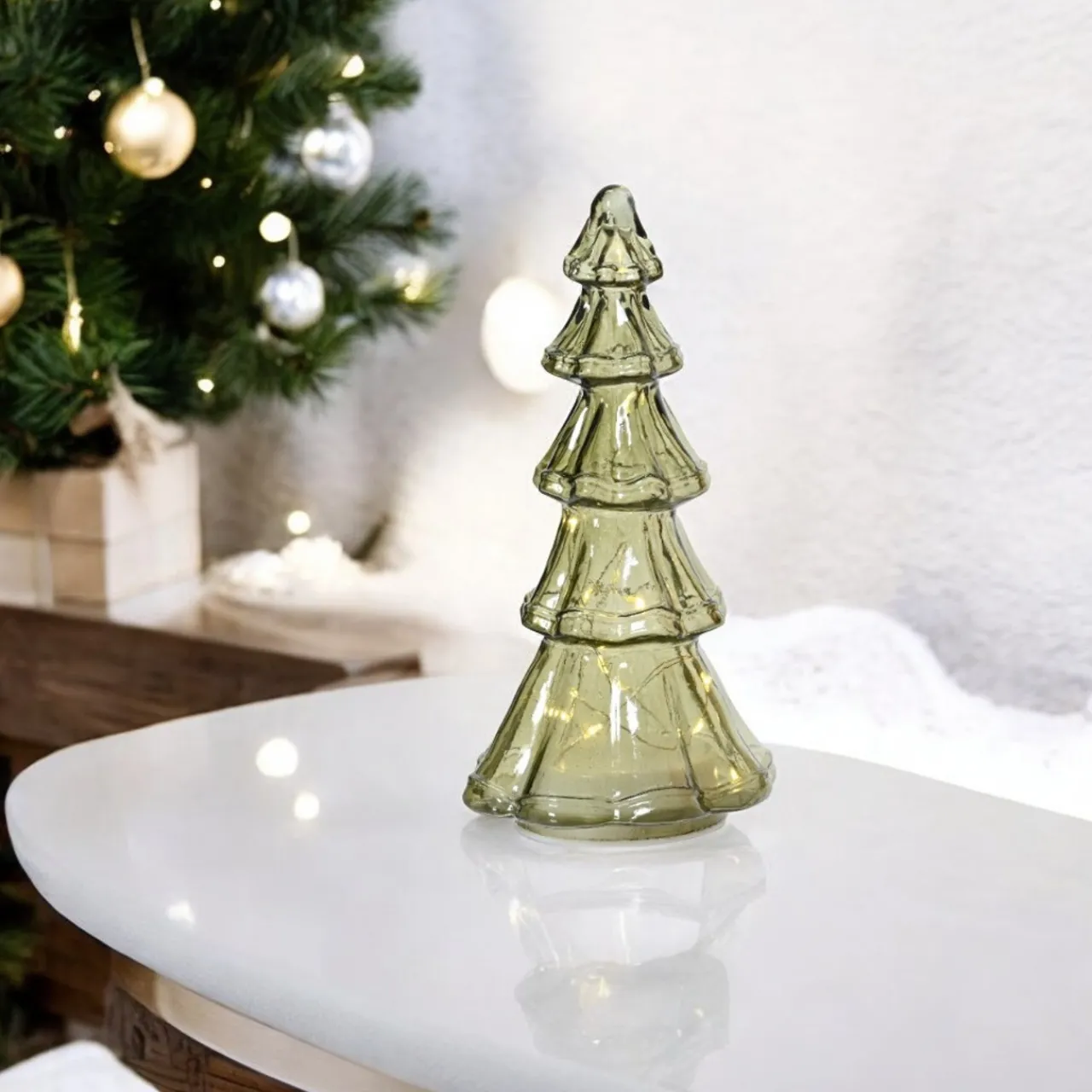 Brighten up your holiday decor with the Lumineo Tall Micro LED Green Tree. Standing at 11.6″ tall, this elegant glass tree is illuminated by warm white micro LEDs, creating a cozy and festive ambiance.