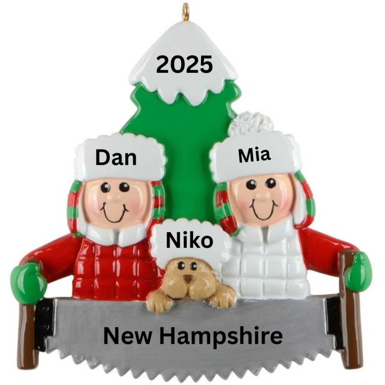 Turn your tree-trimming adventure into a cherished keepsake with our Tree Cutting Couple With Dog Personalized Ornament! This cozy duo is dressed for winter fun and joined by their adorable pup, all ready to cut down the perfect Christmas tree. Featuring a snowy evergreen backdrop and classic saw, it’s paw-sitively heartwarming.