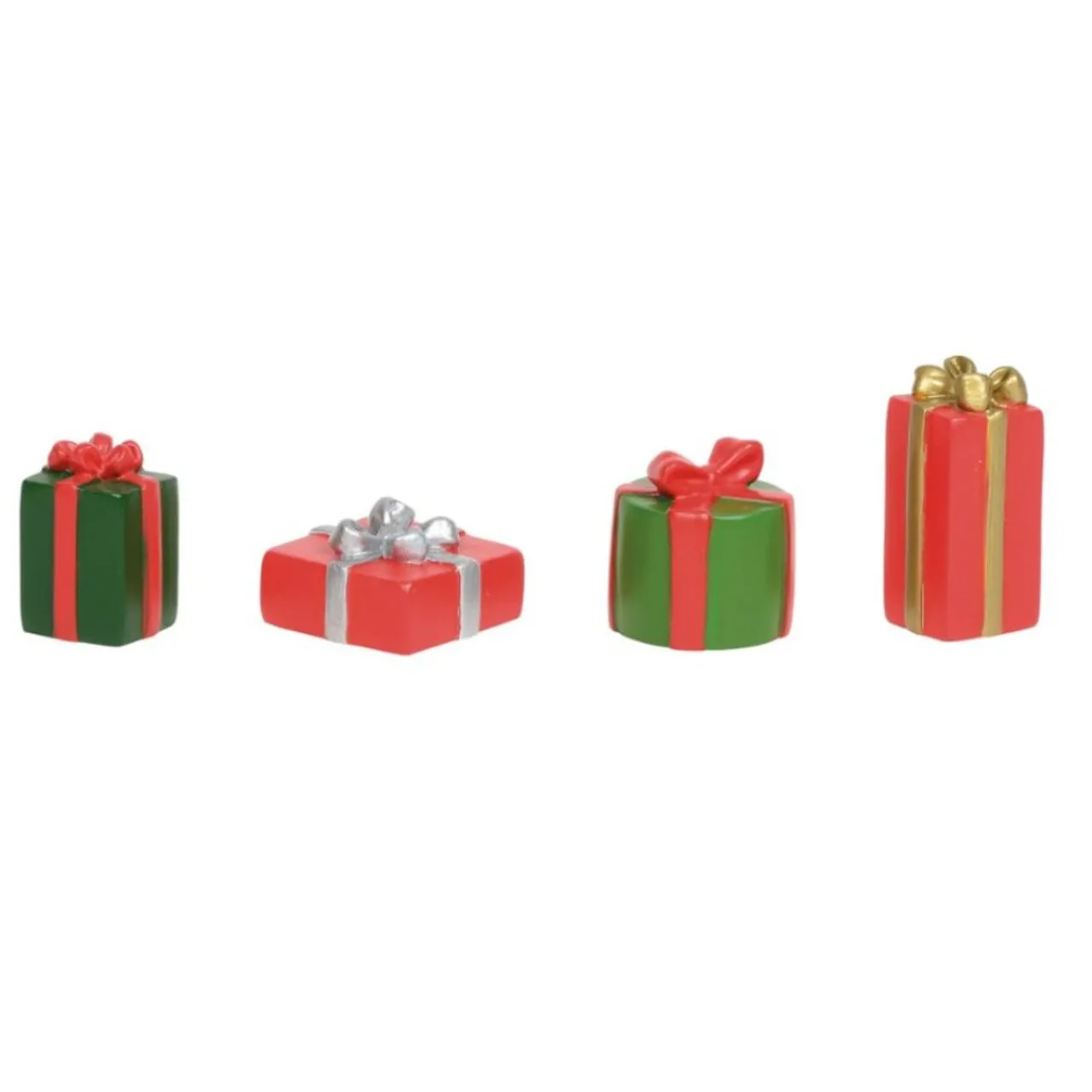 - Set includes 4 individual packages (green with red bow, red with silver bow, circular green with red bow and tall red with gold bow)