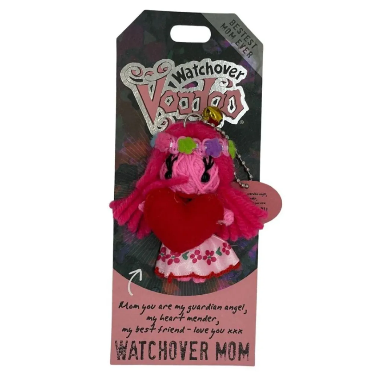 Celebrate your mom with The Watchover Mom Charm. This adorable voodoo-inspired doll features bright pink yarn hair, a floral headband, and a plush red heart, symbolizing love and appreciation. Handcrafted and full of charm, it makes the perfect accessory for keychains, bags, or backpacks.