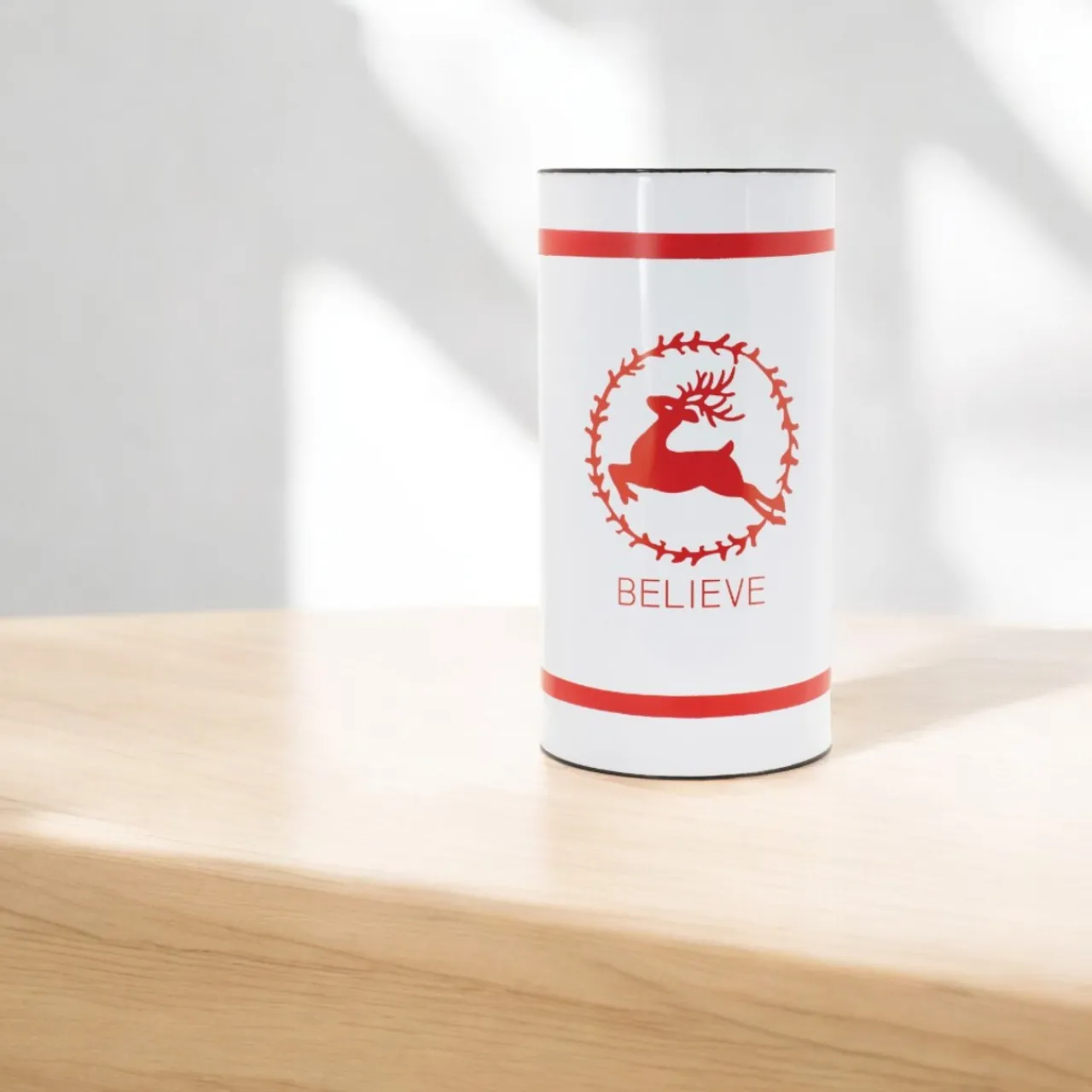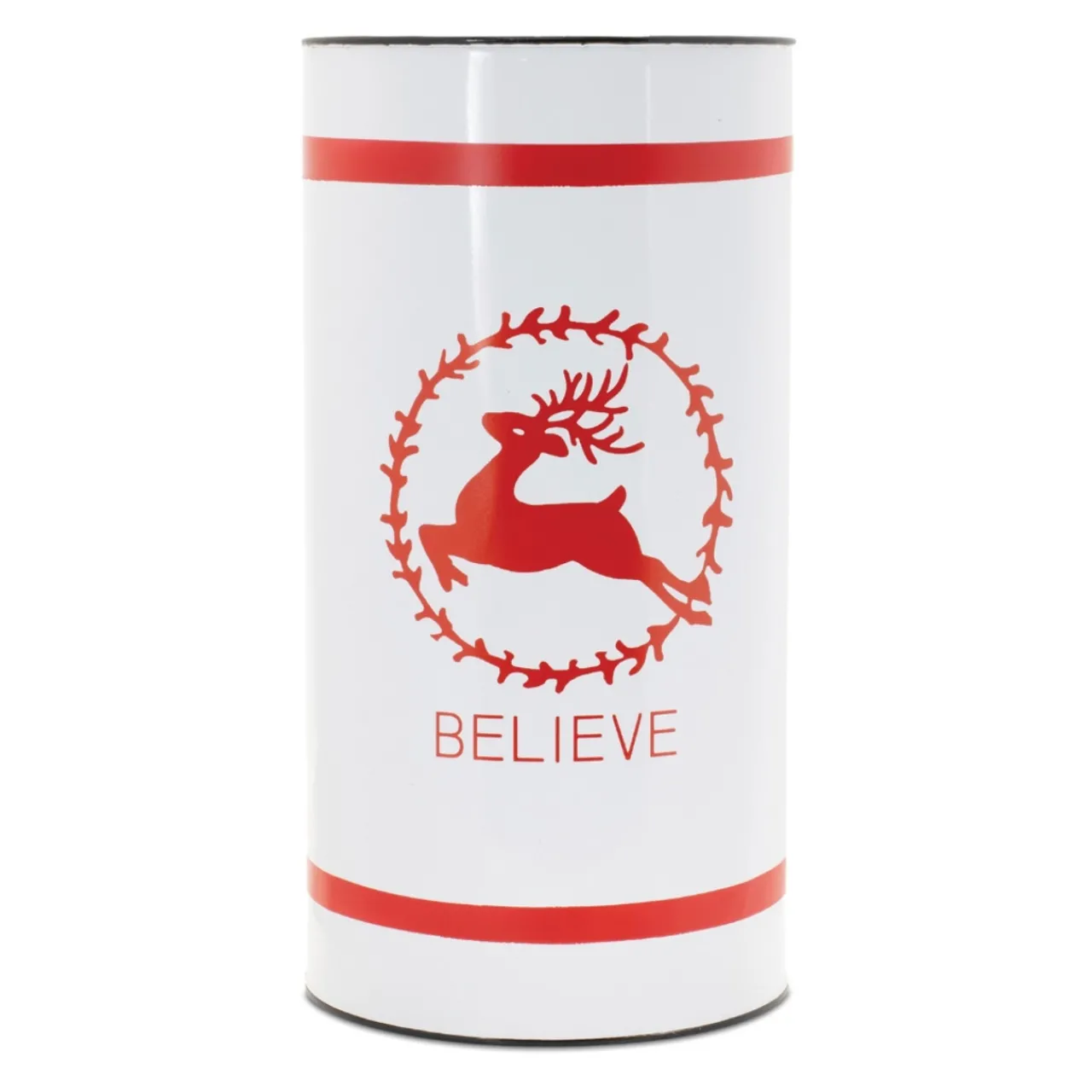 Spread holiday magic with this charming White “Believe” Holiday Container. Standing 14 inches tall and 8 inches in diameter, this iron container features a bold red reindeer design and the inspiring message “Believe.”