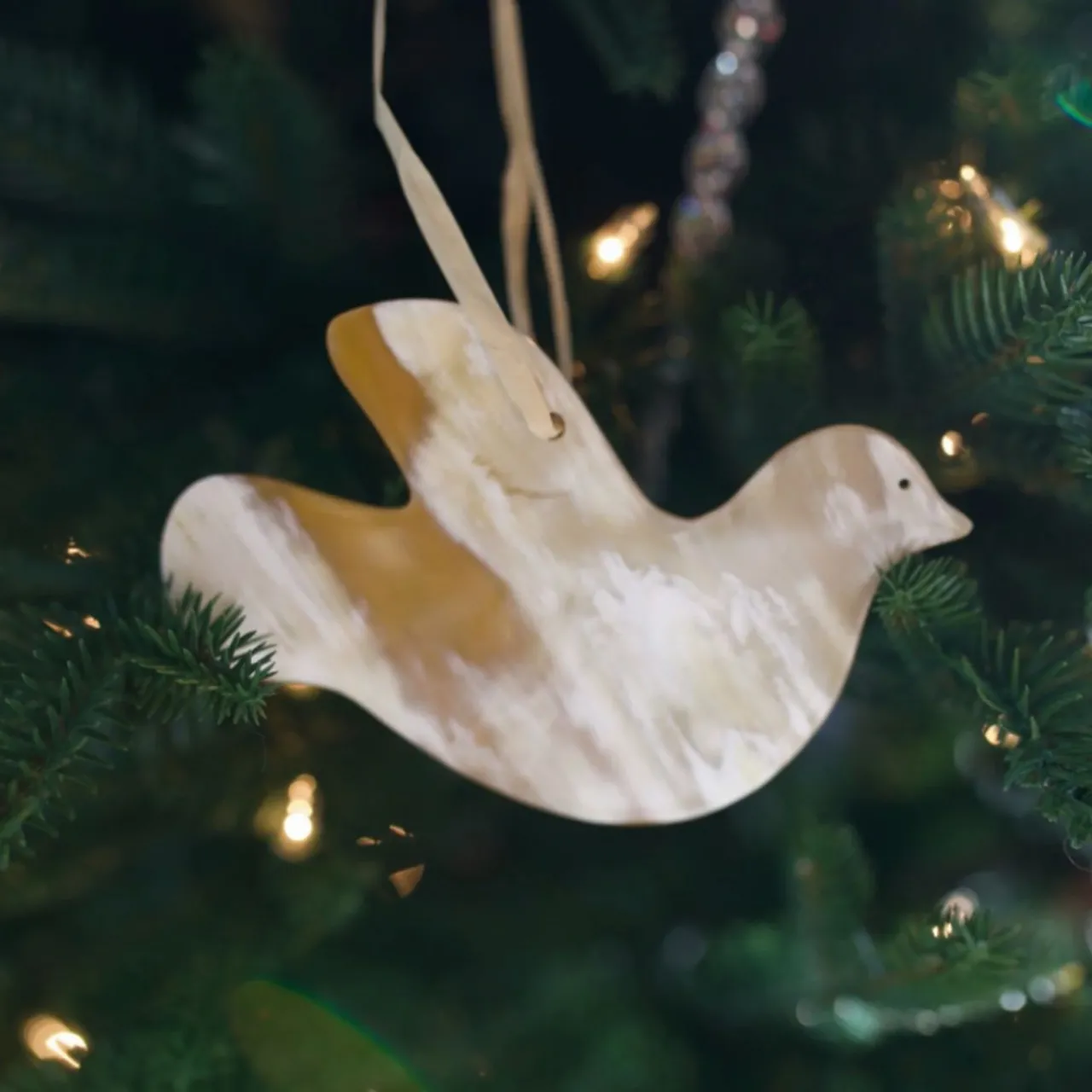 Embrace the spirit of peace this holiday season with our White Dove Cow Horn Ornament. Crafted from natural cow horn, this 3-inch dove ornament brings a gentle, organic elegance to your Christmas tree.
