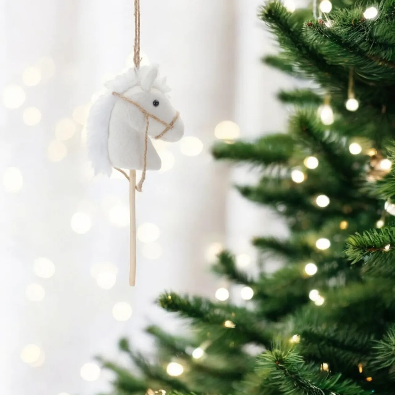 Bring nostalgic charm to your holiday décor with this 14.25-inch White Hobby Horse Ornament! Made from soft polyester, this classic toy-inspired decoration features a white horse head with a fluffy mane and simple rope reins, mounted on a wooden stick.