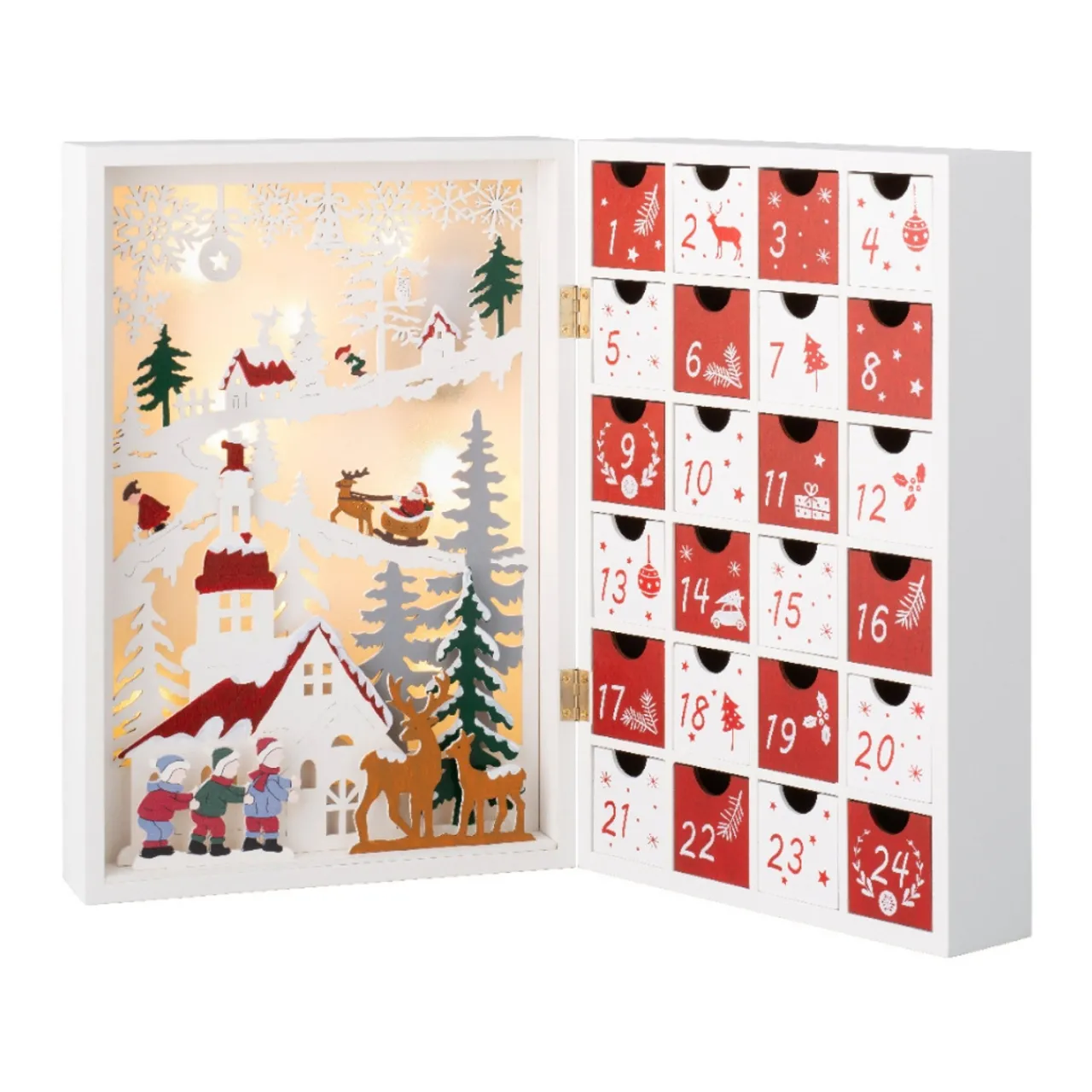 Battery-operated with warm white LED lights, it adds a magical glow to your holiday decor. Made from durable wood, this advent calendar is perfect for creating cherished holiday memories.